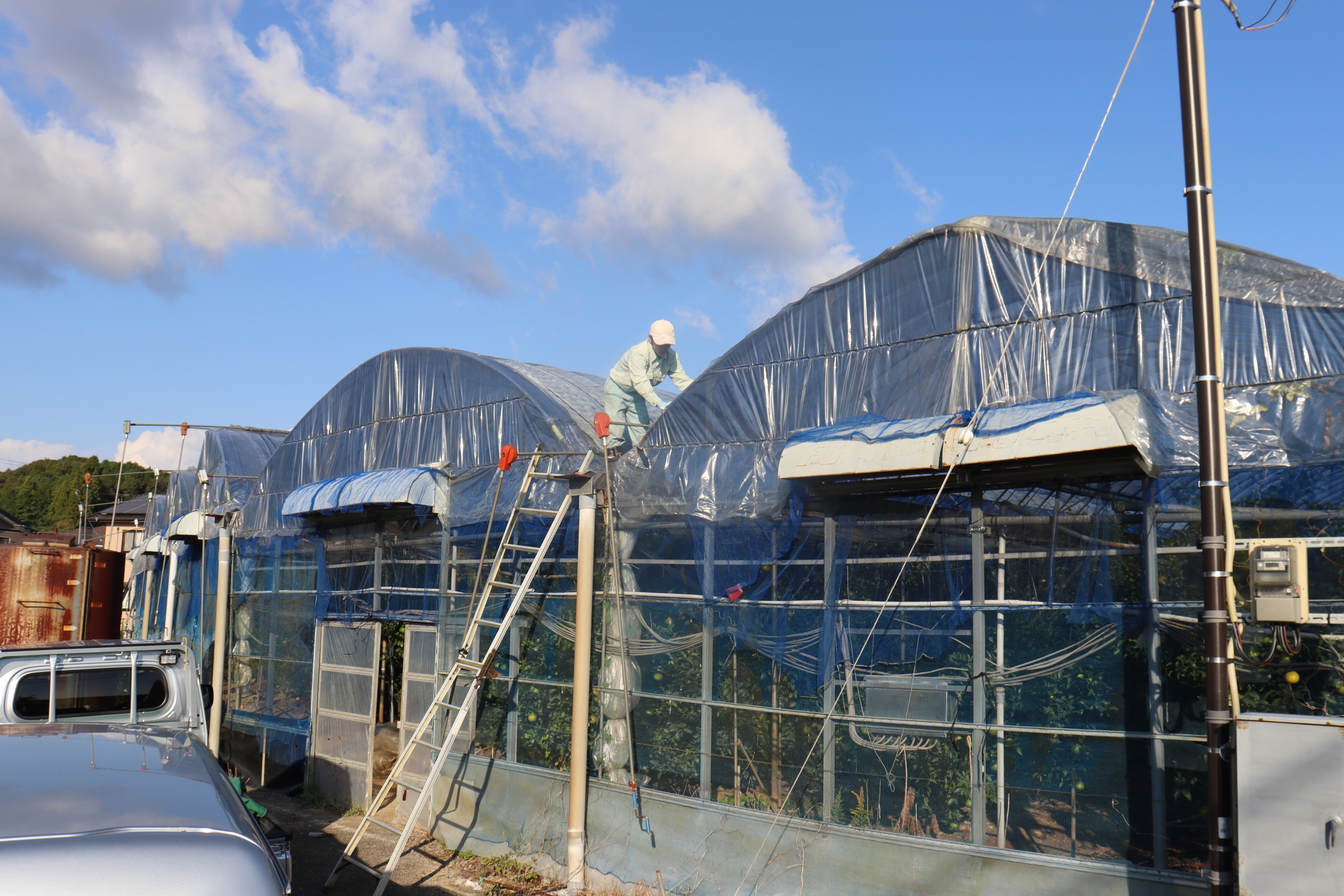 10月24日には、JA職員4名を含む21名で作業依頼のあった4名の生産者のもとへ出向き、デコポンのハウス計51アールのビニール被覆作業を行いました。支援作業を依頼された池田憲昭さんは「昨年は雨が降ったので、今年は良い天気のなか作業してもらって良かった。高齢になると高所での作業は難しいため、若い青年部の力はとても助かる」と話していました。