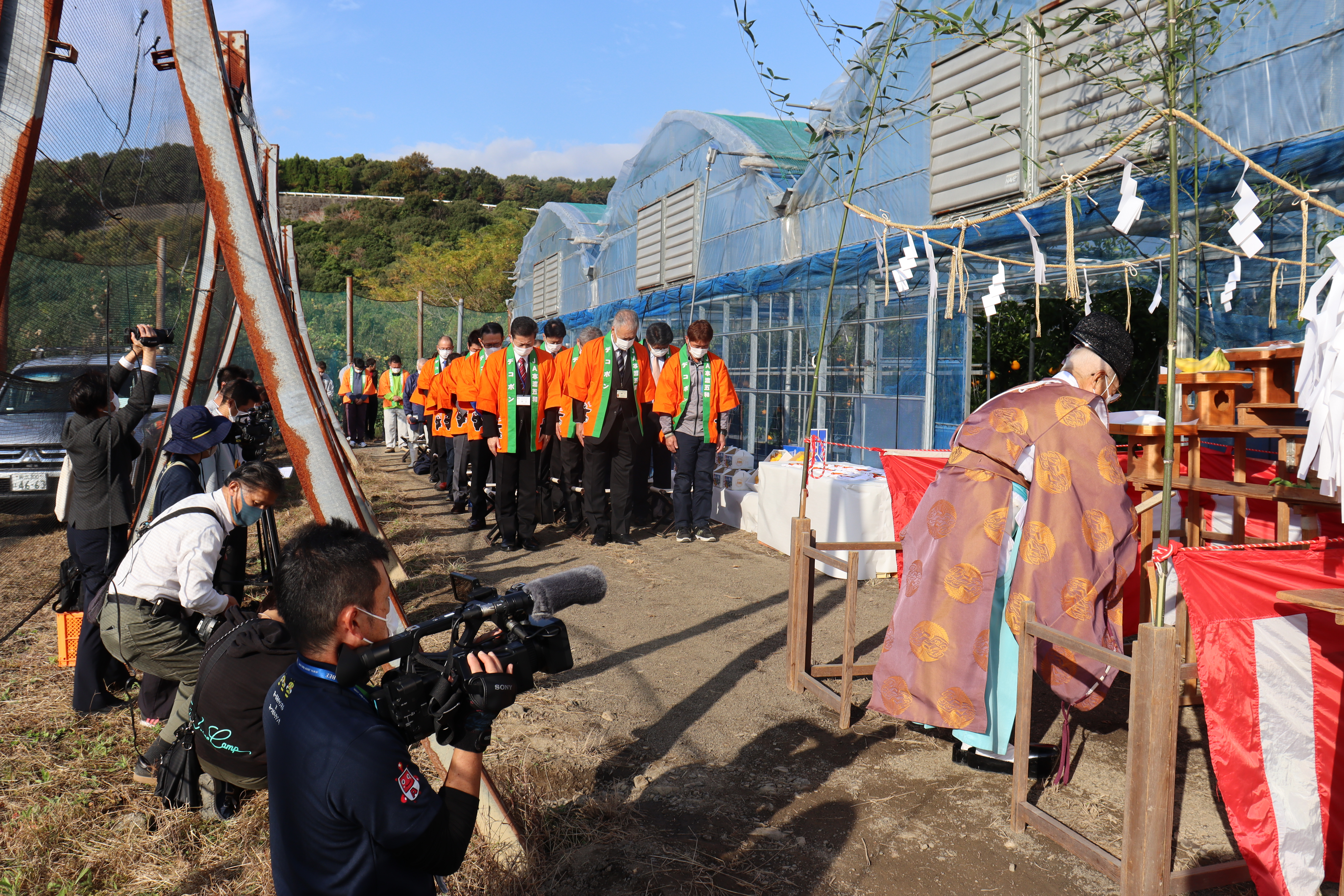 収穫祭には生産者とJA関係者など50人が参加。下浦神社の金子宮司により神事が執り行われ、本格的な収穫を前に、作業の安全と高値販売を祈願しました。神事に続いて、園主の松岡さんやJA関係者により「ハサミ入れ」が行われ、たわわに実ったデコポンが収穫されました。