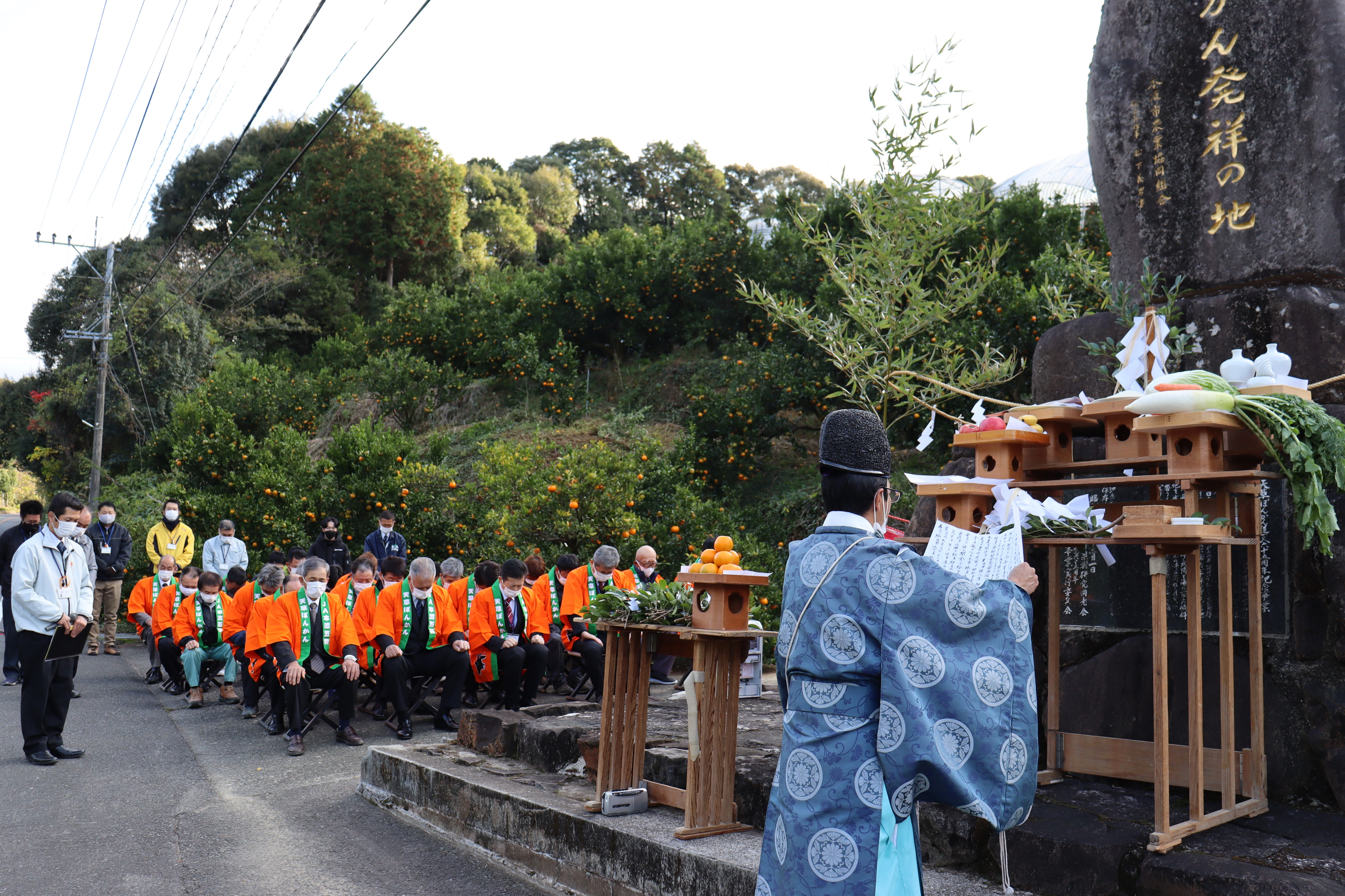 令和4年産のポンカン収穫を前に、収穫作業の安全と高値販売を願い、生産者やJA関係者他30名が参加し、下浦神社の金子宮司により神事が執り行われました。