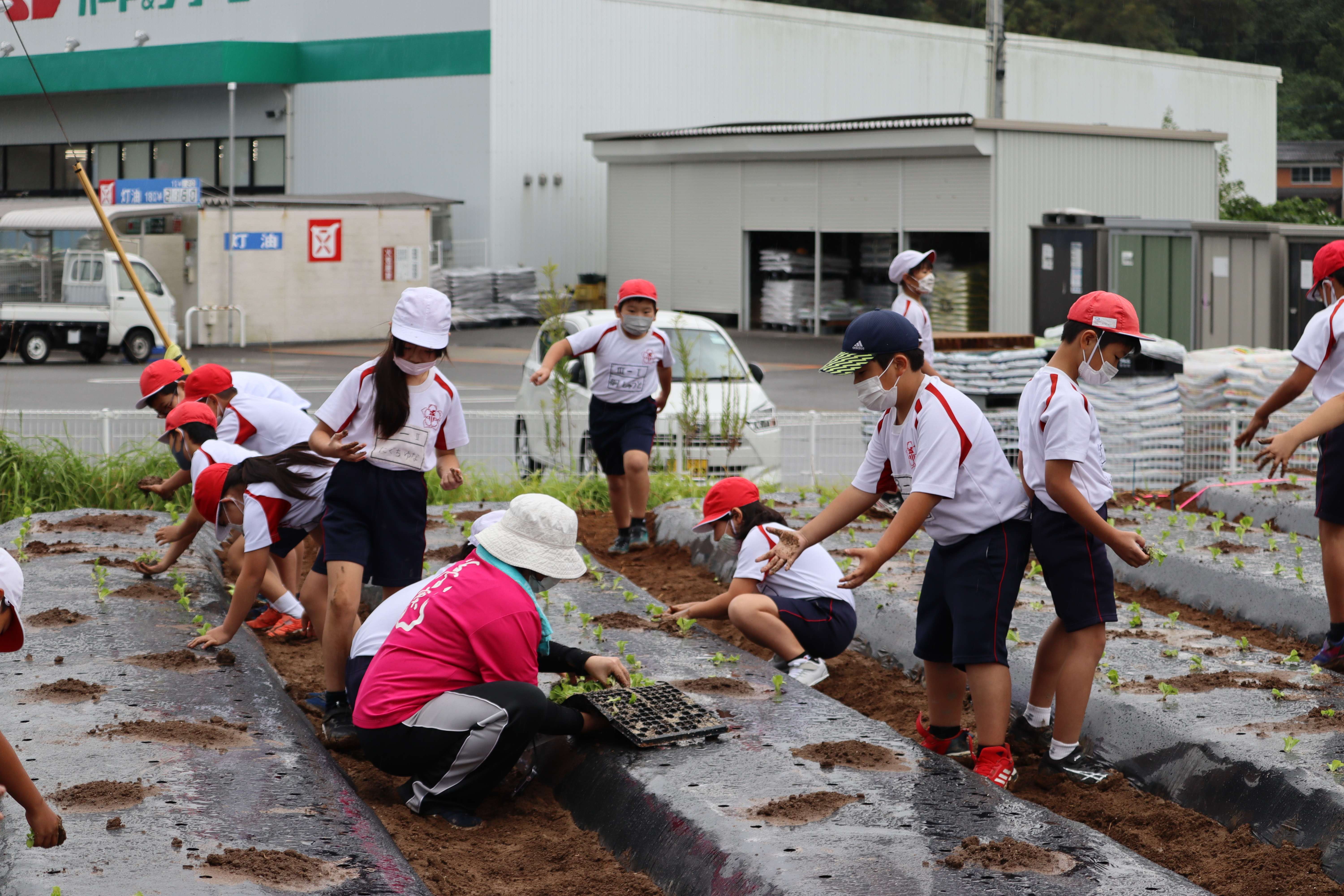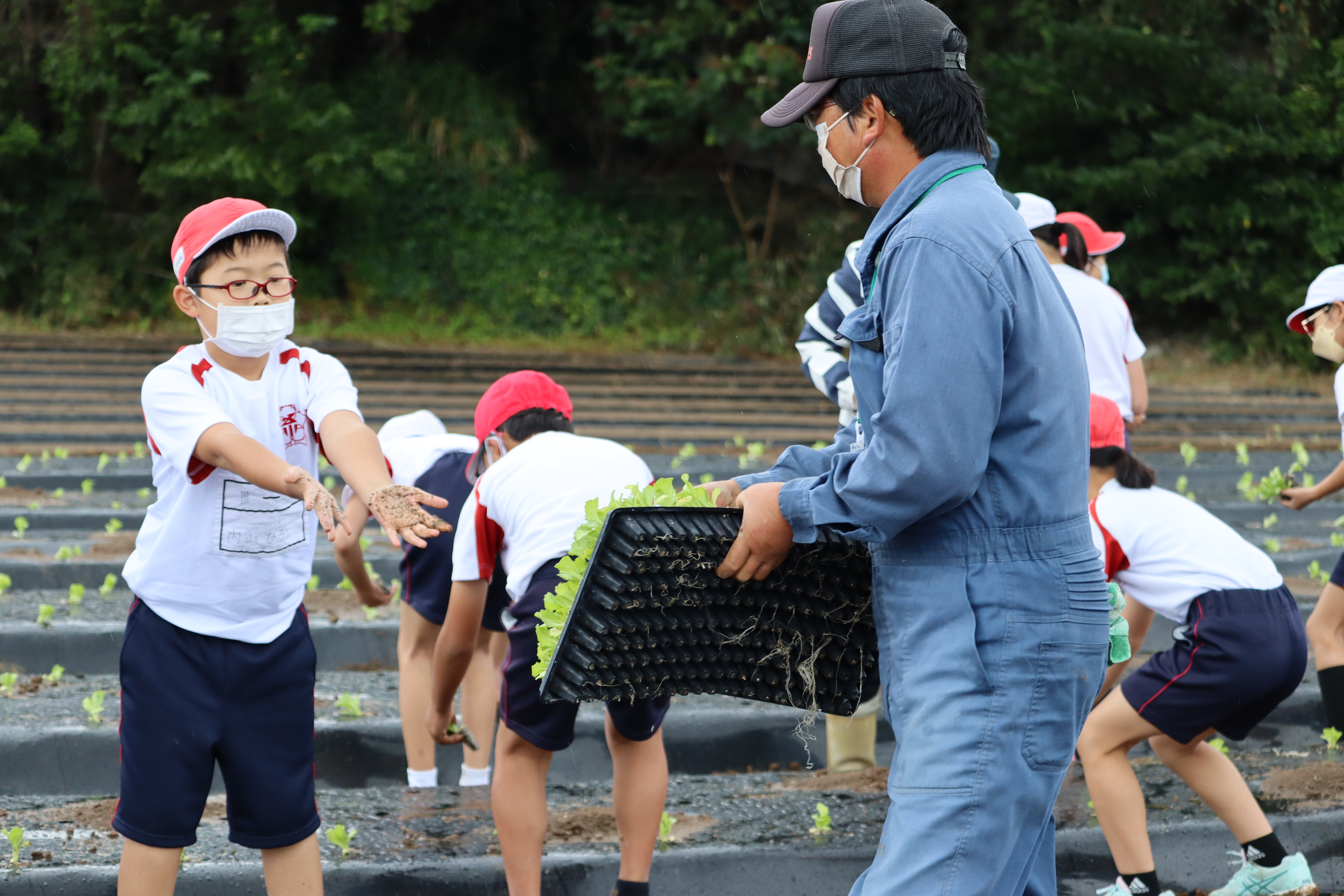 7日には学級園と学校近くの小田さんのレタス畑に2500本ほどの苗を植え付けました。小雨が降る中、児童たちは靴が泥だらけになりながら、笑顔で苗を植えていました。「まだしたい」「楽しかった」などと話していました。