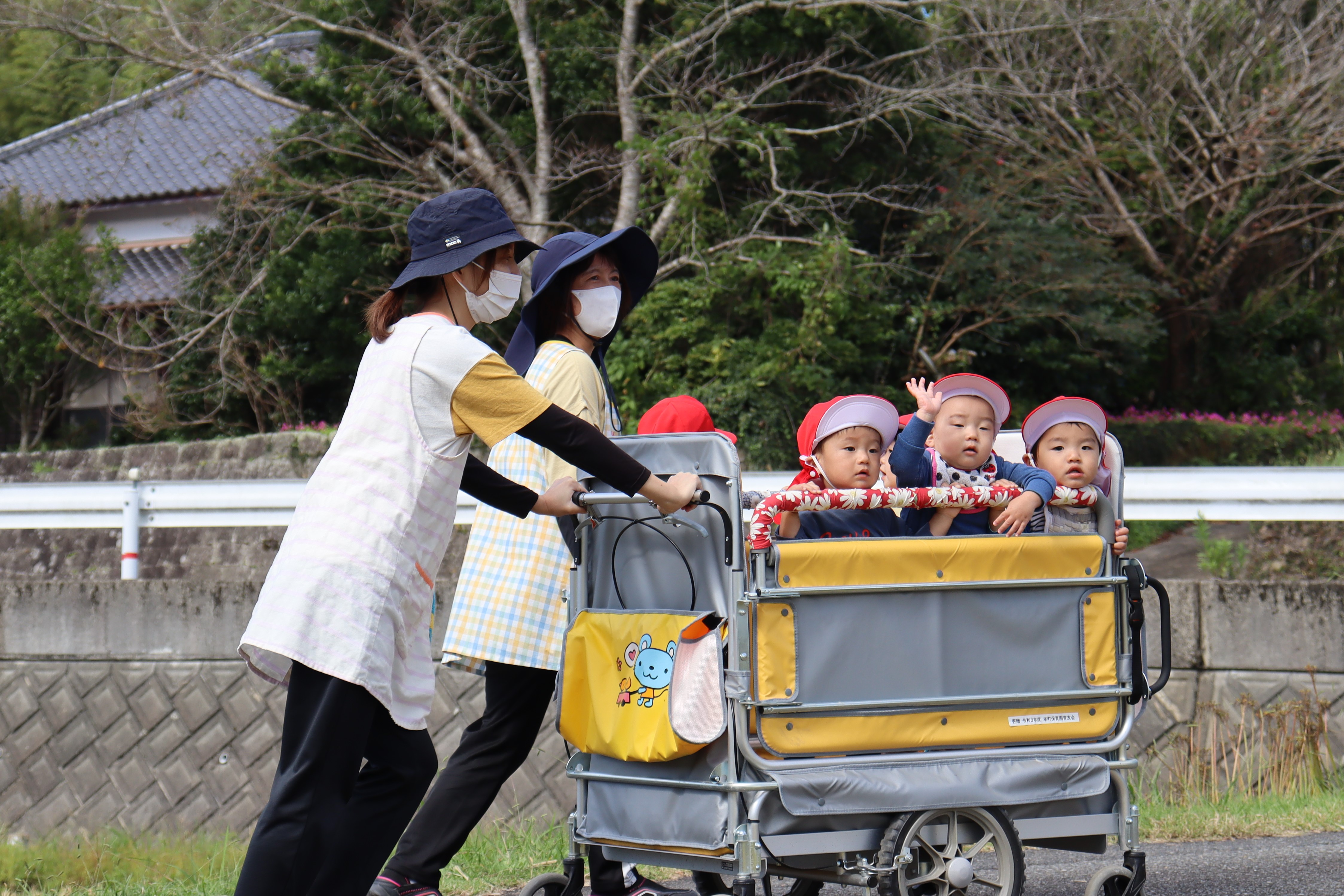 10月12日、本町営農組合は本町保育園の園児30人に稲刈りの体験学習を行いました。