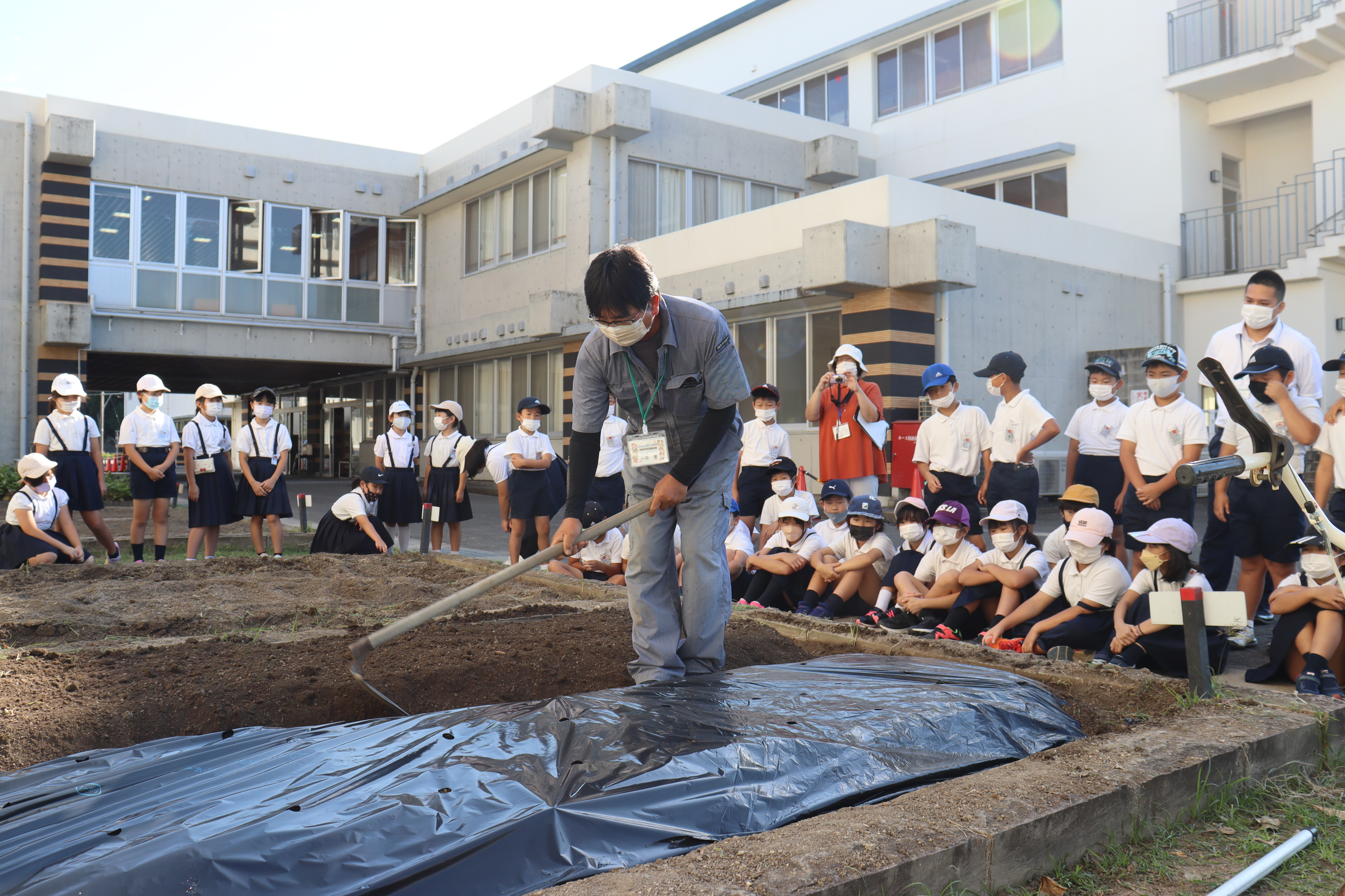 また、10月3日には学級園で施肥から耕うん、畝立てとマルチ貼りまでの一連の作業を見学し、畝やマルチを貼る理由なども学習。