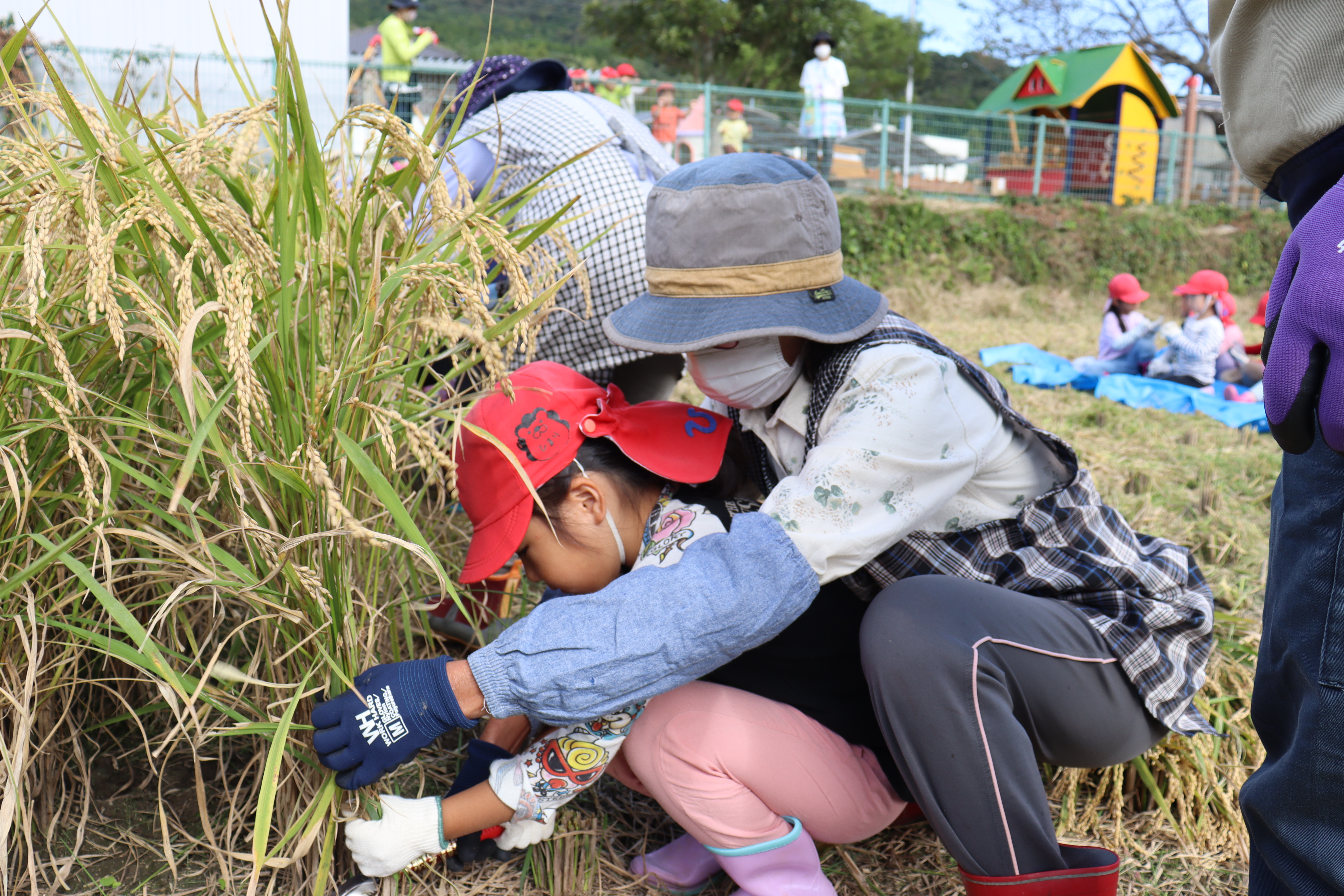 大人顔負けのスピードで手際よく刈り取る園児もいて、見学していたお母さんは「家でもよく手伝ってくれるので助かっています」と笑顔でカメラのシャッターを切っていました。