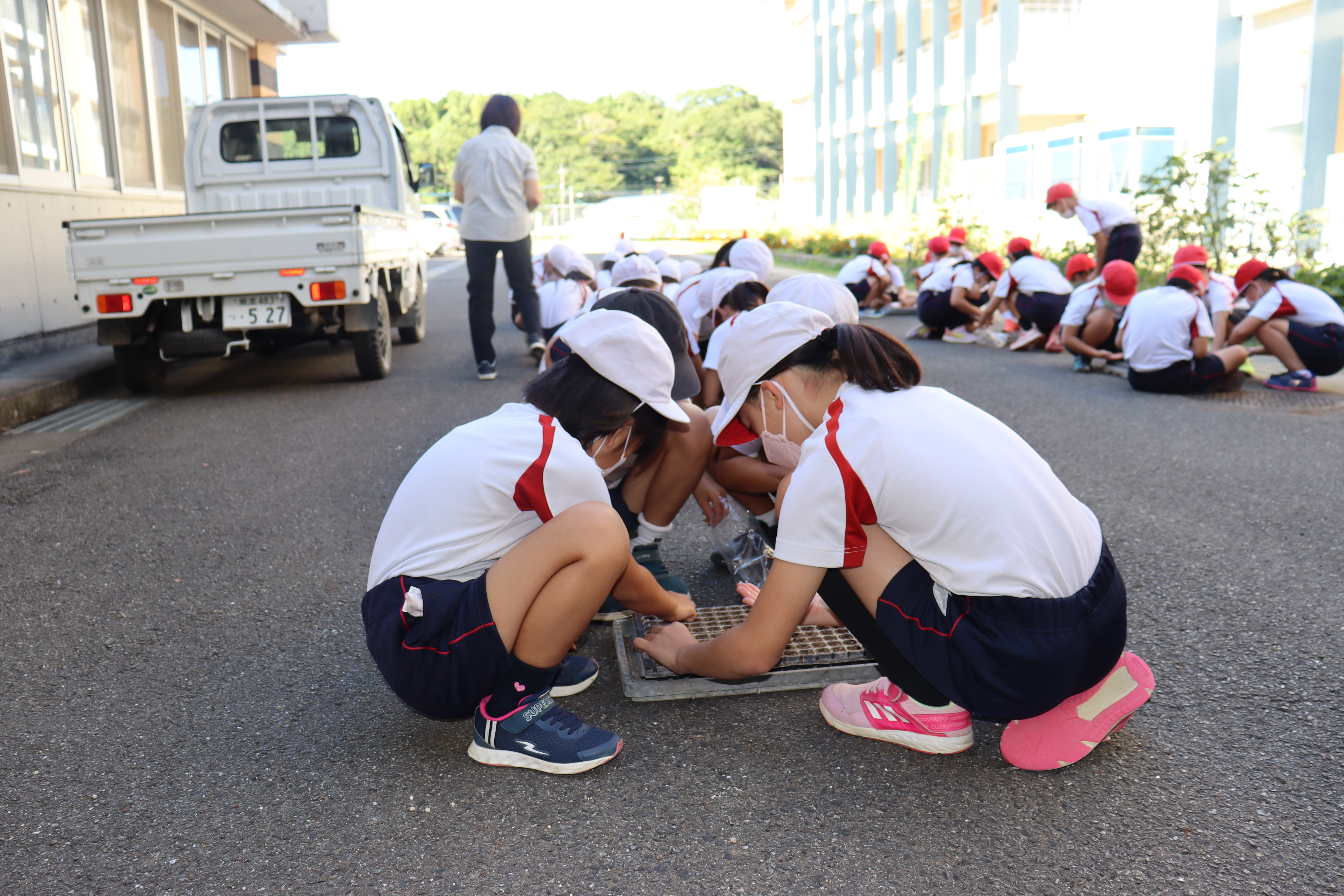 JA本渡五和のレタス部長を務める小田豊さんが9月15日に、五和小学校の校内で3年生40人にレタスの種蒔き体験を実施しました。